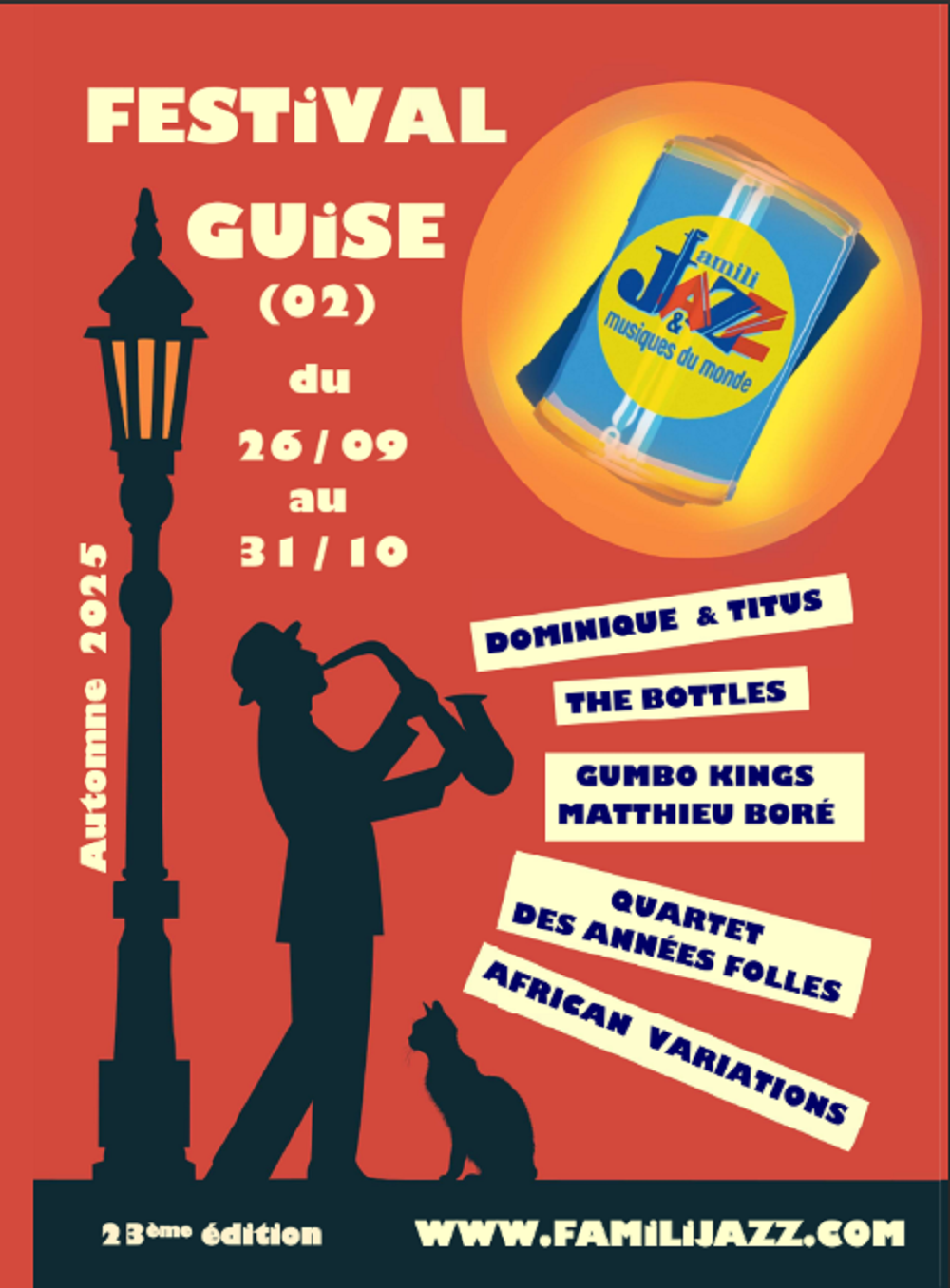 Nous vous invitons cet automne à venir découvrir la 23e édition du Familijazz, qui se tiendra dans les villes de Guise, Sains-Richaumont et Marly-Gomont, et qui rassemblera de nombreux artistes qui se produiront du 26 septembre au 31 octobre 2025.