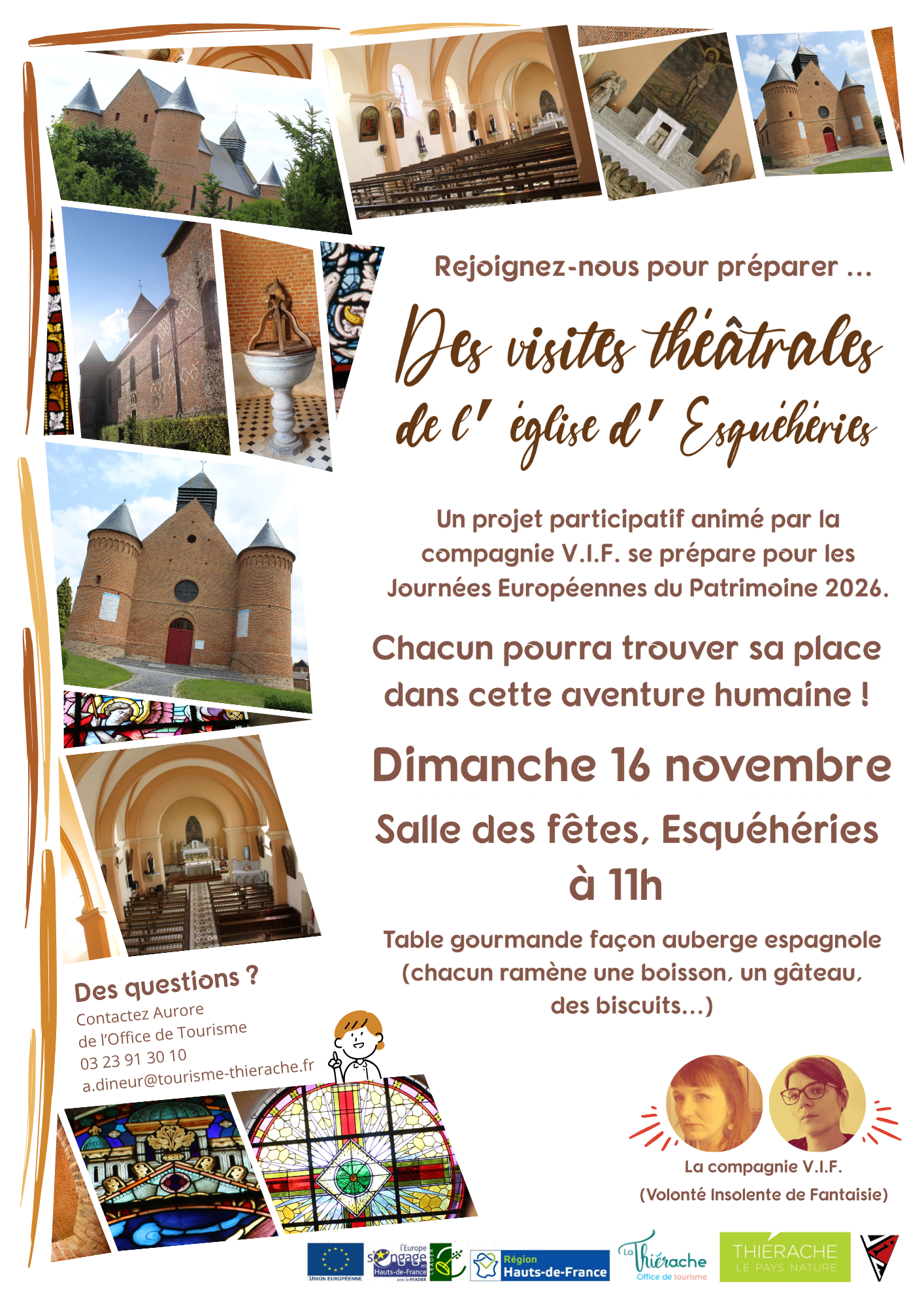 Un projet participatif animé par l’association V.I.F. se prépare pour les Journées Européennes du Patrimoine 2026 : des visites théâtrales de l’église fortifiée Saint-Martin d’Esquéhéries. Ces visites théâtrales se feront sous la forme de déambulations d’acteurs et de figurants autour et dans l’église, marquant des arrêts en certains lieux où se dérouleront des saynètes.