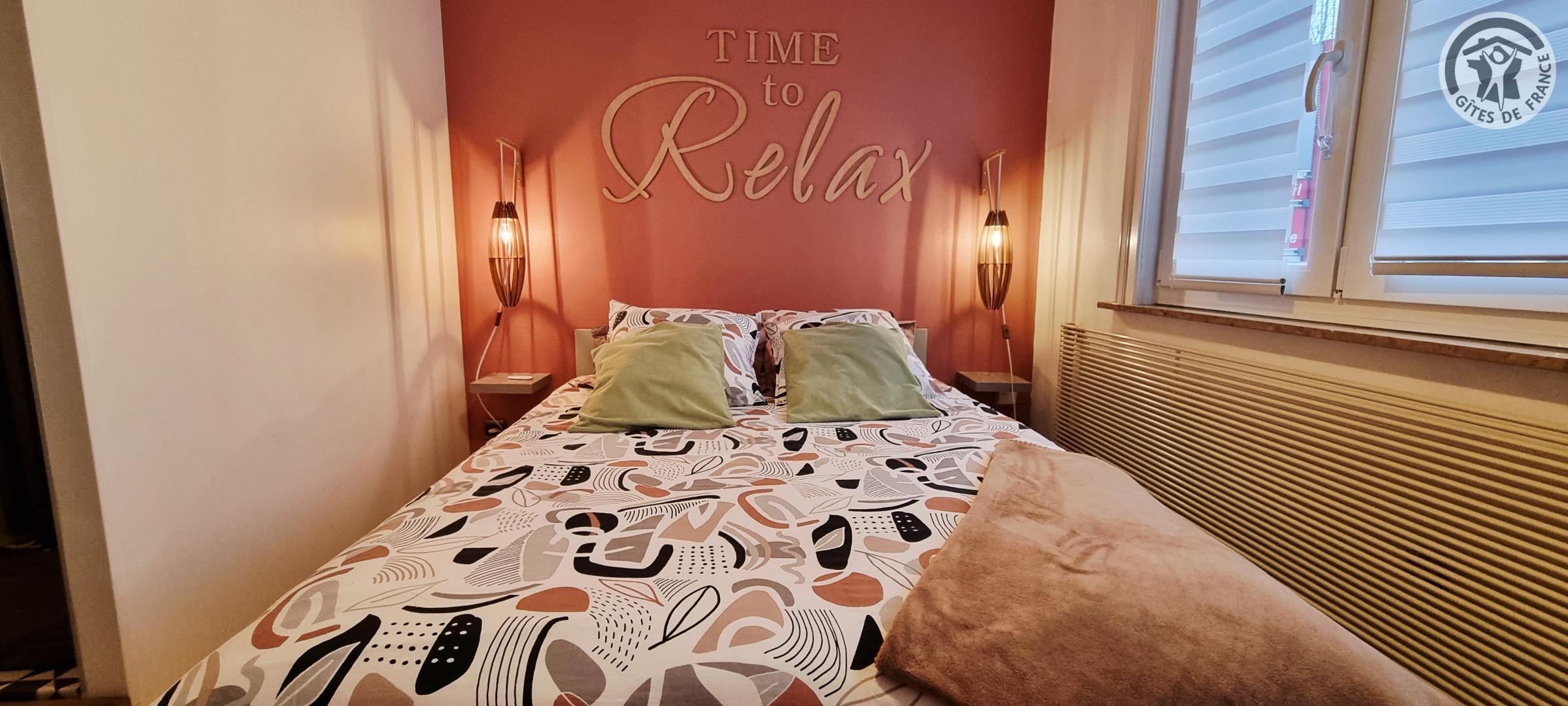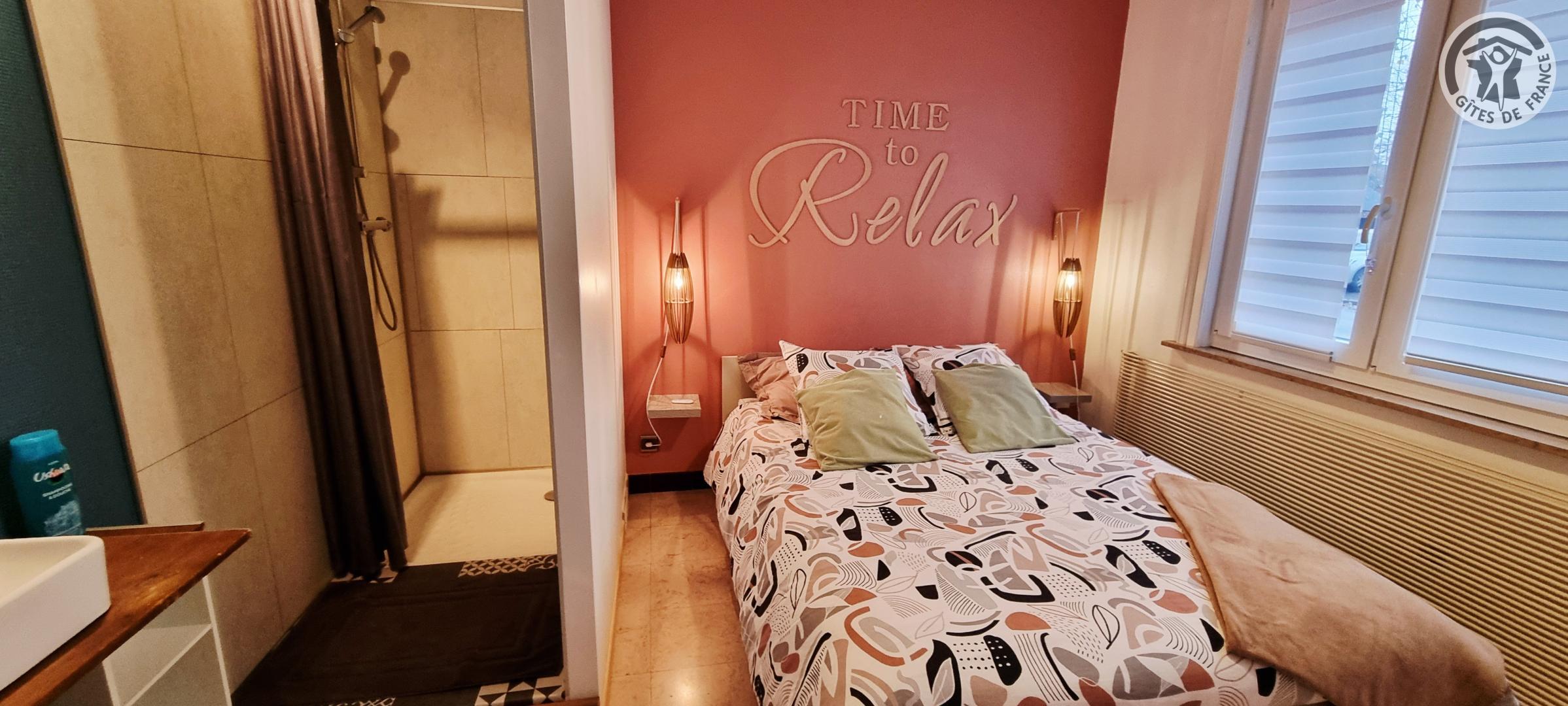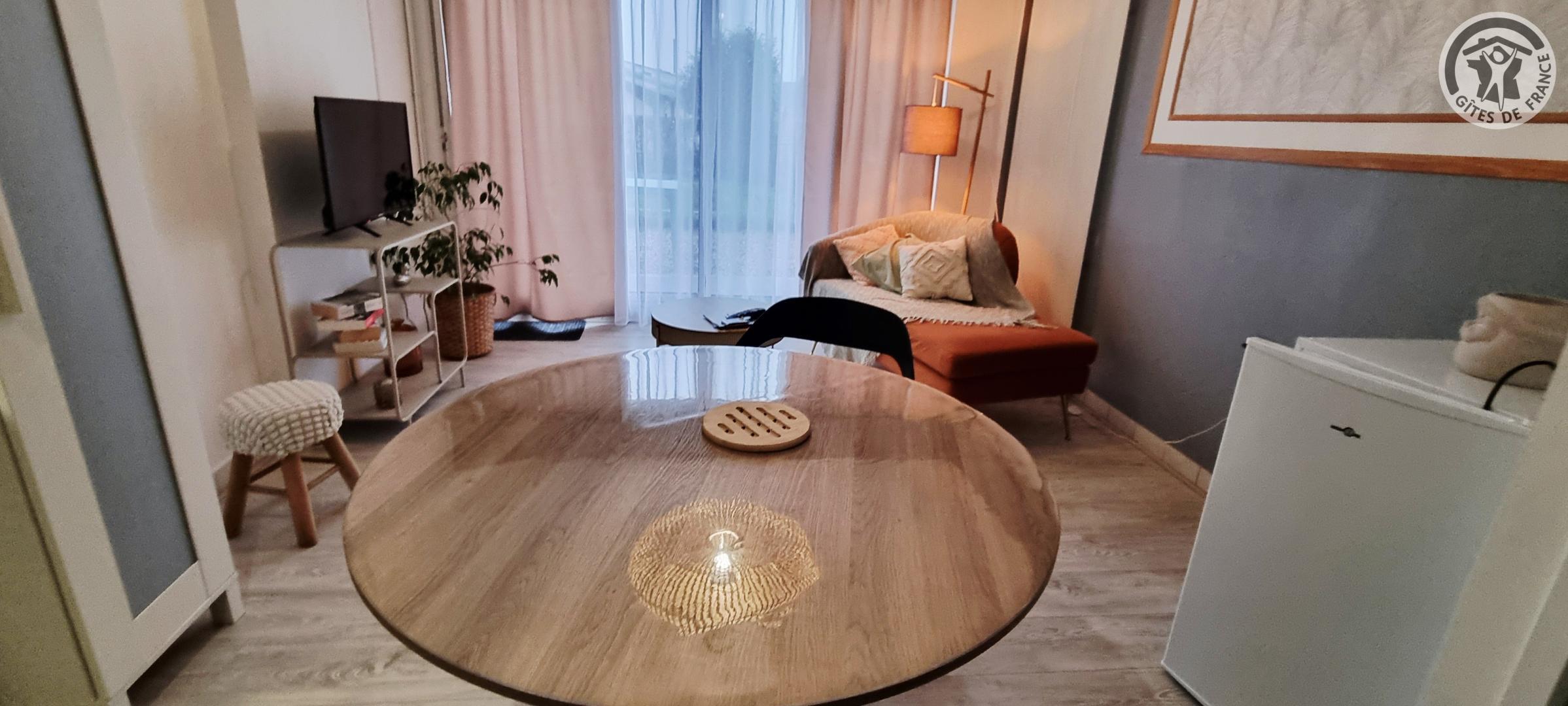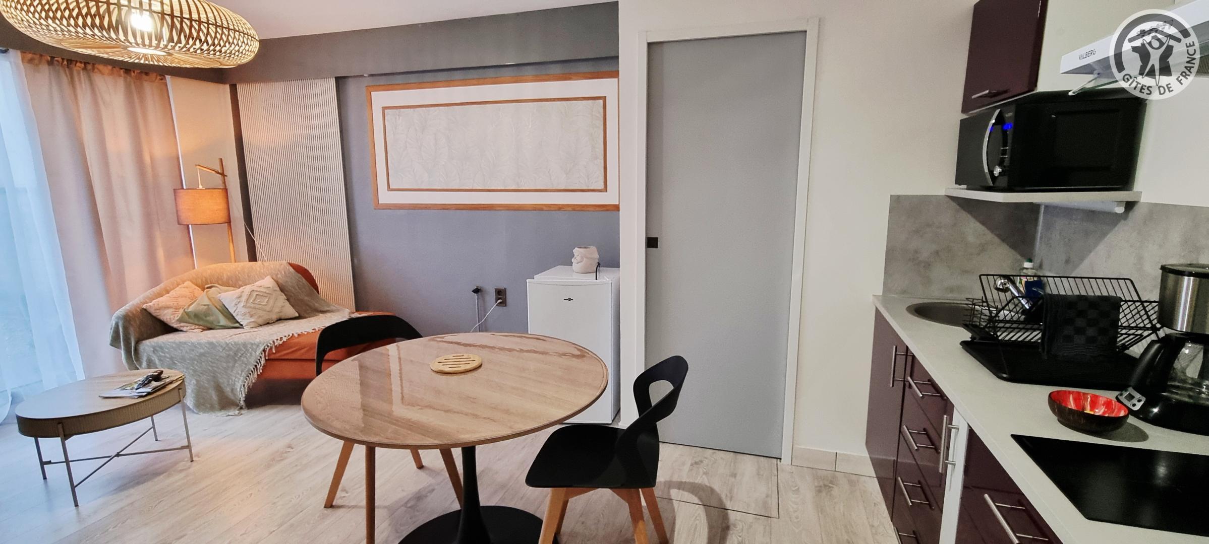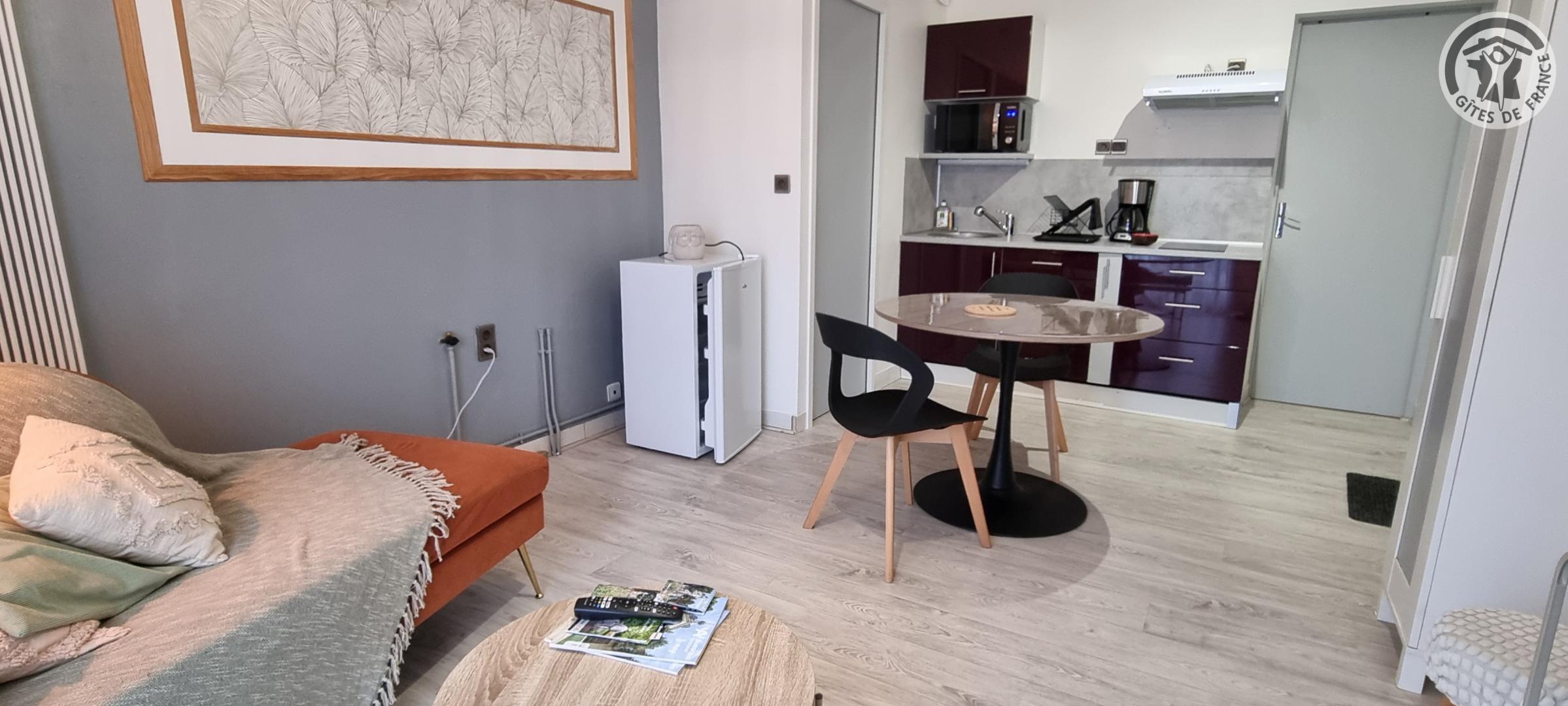 Petit gîte de plain-pied situé à 400 mètres du centre de la commune. Pièce de vie avec un canapé, TV, petite cuisine équipée (plaque à induction 2 foyers, combiné four micro-ondes, frigo table-top sans compartiment congélateur, hotte aspirante, cafetière à filtre, grille-pain, bouilloire), table et chaises. Chambre avec un lit double en 140x200cm, une vasque et une douche en 80x80cm. WC indépendant. Pas de lave-vaisselle, ni de lave-linge. Terrasse gravillonnée de 30m² avec salon de jardin et barbecue au charbon. Gîte en tout inclus (draps, linge de toilette, ménage de fin de séjour et charges énergétiques compris dans le prix).