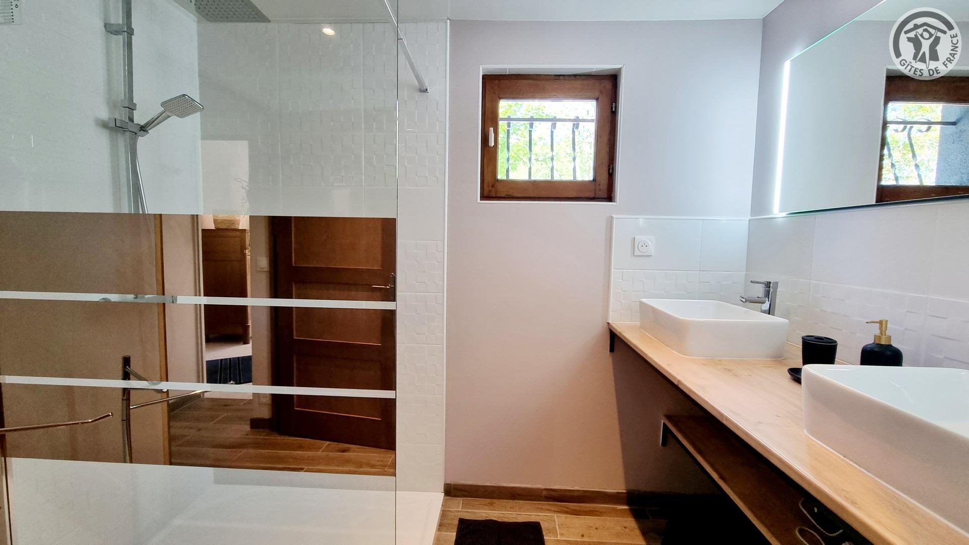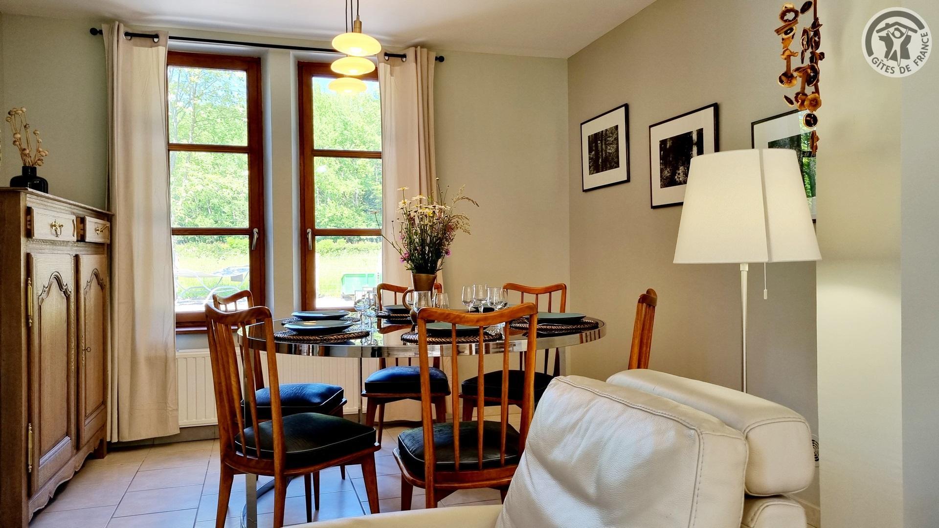 Belle maison indépendante de 100 m² en lisière de bois, à 3 km du centre du village. Parking privatif pour plusieurs véhicules. Extérieurs avec salon de jardin, salon de détente , hamac, barbecue. Préau avec baby-foot, table de ping-pong et 4 vélos prêtés gratuitement. Jardin clos sans vis-à-vis. Rez-de-chaussée : Cuisine équipée (plaque avec 3 foyers à induction, four encastré, réfrigérateur/congélateur, lave-vaisselle, four micro-ondes, hotte aspirante, etc.), salle à manger/salon avec cheminée à insert (bois fourni), TV écran plat 80cm. Salle d'eau avec douche italienne en 120x90cm et double vasque. WC indépendant. Étage : 3 chambres dont une avec un lit en 160x200, une avec un lit en 140x190 et une avec 2 lits en 110x190. Équipement bébé (lit, chaise haute et baignoire). Wifi. Gîte en tout inclus (draps, linge de toilette, ménage de fin de séjour et charges énergétiques compris dans le prix de location).